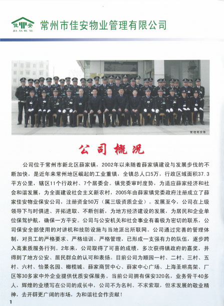 佳安物業(yè)管理有限公司位于常州市新北區(qū)薛家鎮(zhèn),2005年由薛家鎮(zhèn)黨委政府注冊成立,注冊資金50萬元,屬于三級資質(zhì)企業(yè)。成立之初,佳安物業(yè)作為政屬事業(yè)單位,主要負(fù)責(zé)管理薛家鎮(zhèn)順園新村安置小區(qū)。隨著薛家鎮(zhèn)經(jīng)濟(jì)和人口的發(fā)展,為主動適應(yīng)經(jīng)濟(jì)發(fā)展新常態(tài),全面深化物業(yè)綜合改革,打造具有薛家特色的物業(yè)公司,佳安物業(yè)由政府下屬的事業(yè)單位正式轉(zhuǎn)變?yōu)楠毩⑦\(yùn)營的企業(yè),并增資到1000萬元。 2017年6月,公司通過審核被評為“AAA”級信用企業(yè),同月,公司實施ISO9001質(zhì)量管理體系標(biāo)準(zhǔn),并于8月通過質(zhì)量體系認(rèn)證審核。2018年8月,公司通過了ISO14001環(huán)境管理體系、ohsas18001職業(yè)健康安全管理體系的認(rèn)證審核。 目前,公司主要承接小區(qū)物業(yè)服務(wù)及廠區(qū)外派保安服務(wù)、保潔服務(wù)等,F(xiàn)公司為薛家鎮(zhèn)順園一村至順園九村安置小區(qū)及奧林匹克花園、怡景名園2處商業(yè)小區(qū)提供物業(yè)服務(wù);為江南農(nóng)村商業(yè)銀行新北區(qū)所有支行、中車鐵馬、投資服務(wù)中心、華夏藝博園、薛家幼兒園、薛家小學(xué)及薛家中學(xué)等單位提供外派保安服務(wù);為薛家鎮(zhèn)中心廣場及松林別墅提供保安服務(wù);為華夏藝博園及投資服務(wù)中心提供保潔服務(wù)等。 在這十余年中,佳安物業(yè)與時俱進(jìn),銳意進(jìn)取,為地方建設(shè)發(fā)展注入動力,為居民和企業(yè)安全保駕護(hù)航,尤其是在實踐中,我們積極探索,正逐步摸索出一條適合薛家城鄉(xiāng)一體化建設(shè)的社區(qū)物業(yè)管理的新路。希望通過今天的分享,和大家一起探討我們在“管辦分離”等方面的實踐經(jīng)驗,并在此基礎(chǔ)上為薛家的可持續(xù)發(fā)展提供可借鑒、推廣的新型物業(yè)管理之路。