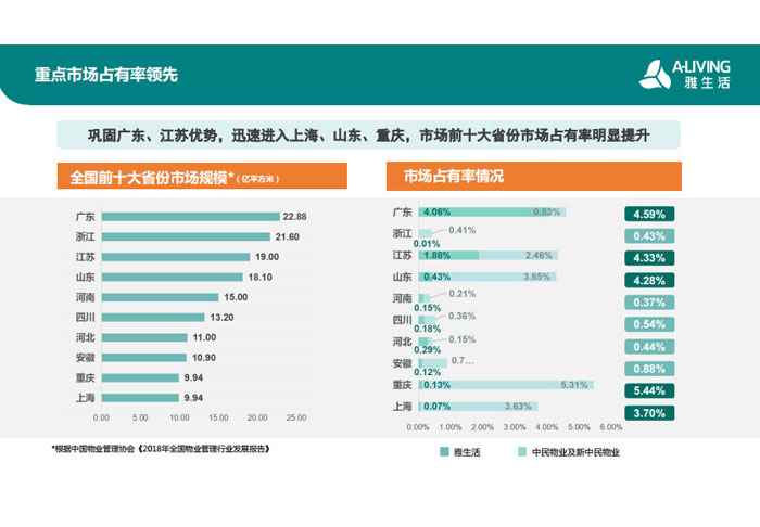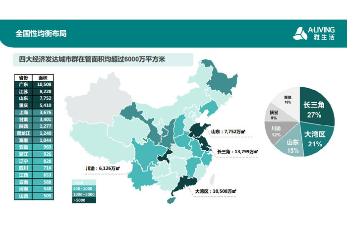 一、立足北上廣,面向全中國,走向全世界 1992年,雅居樂物業(yè)開篇中山,率先引入港式物業(yè)管理模式。1997年,依托雅居樂地產(chǎn)的崛起,連續(xù)接管中山多個項目,成為高端大盤物業(yè)管理的領(lǐng)跑者。1999年,雅居樂物業(yè)開啟專業(yè)化發(fā)展模式,全面通過英國皇家BSI的ISO9000質(zhì)量管理體系認證,2001年成為國家首批一級物業(yè)管理資質(zhì)企業(yè)。 2002年,隨著廣州雅居樂花園的盛大啟幕,雅居樂物業(yè)邁開向廣州進軍的步伐。為尋求更長遠的發(fā)展,雅居樂積極構(gòu)思上市藍圖,2005年在香港成功上市。在深耕珠三角城市群的同時,2006年雅居樂物業(yè)揮師北上,正式開啟全國部署戰(zhàn)略。2008年,接管海南清水灣項目,揭開旅游地產(chǎn)物業(yè)管理的新篇章。 接下來近十年里,雅居樂物業(yè)始終保持著最年輕的成長姿態(tài),依托“管理數(shù)字化、服務(wù)專業(yè)化、流程標準化和操作機械化”的發(fā)展戰(zhàn)略,雅居樂物業(yè)榮膺2018中國物業(yè)服務(wù)百強企業(yè)第11名,2018年中國物業(yè)服務(wù)百強企業(yè)成長性第二名、2018年中國物業(yè)服務(wù)百強服務(wù)質(zhì)量領(lǐng)先企業(yè)、2018年中國物業(yè)服務(wù)百強滿意度領(lǐng)先企業(yè)、2018中國物業(yè)服務(wù)百強經(jīng)營績效領(lǐng)先企業(yè)、旅游地產(chǎn)物業(yè)管理領(lǐng)先品牌、2018年中國辦公物業(yè)管理優(yōu)秀企業(yè)(綠地物業(yè))、2017中國物業(yè)管理企業(yè)品牌價值第12名、2017中國物業(yè)管理企業(yè)綜合實力第12名、中國藍籌物業(yè)企業(yè)、《旅游地產(chǎn)物業(yè)管理服務(wù)標準》(團體標準)起草工作等多項殊榮。 目前,雅生活集團已形成廣州、中山、深圳、南京、上海、西安、成都、海南、云南、北京、鄭州、南寧、沈陽、武漢、馬來西亞十五大城市公司全面發(fā)展的蓬勃態(tài)勢。截止2017年12月31日,雅生活集團管理范圍覆蓋全國逾69座城市與地區(qū),服務(wù)類型涵蓋主流住宅、高端豪宅、旅游地產(chǎn)、商業(yè)、寫字樓等多種業(yè)態(tài),合約總建筑面積為12610萬平方米,擁有200多個項目,服務(wù)業(yè)主逾100萬人。 2017年6月,雅生活集團收購綠地物業(yè)100%股權(quán),并與綠地集團簽署戰(zhàn)略合作協(xié)議,8月,綠地集團投資10億元獲得雅生活集團20%股權(quán)。未來,雅生活集團將實施“雅居樂物業(yè)”與“綠地物業(yè)”雙品牌驅(qū)動戰(zhàn)略,還將尋求在A股上市,力爭打造中國物業(yè)“A+H”第一股。