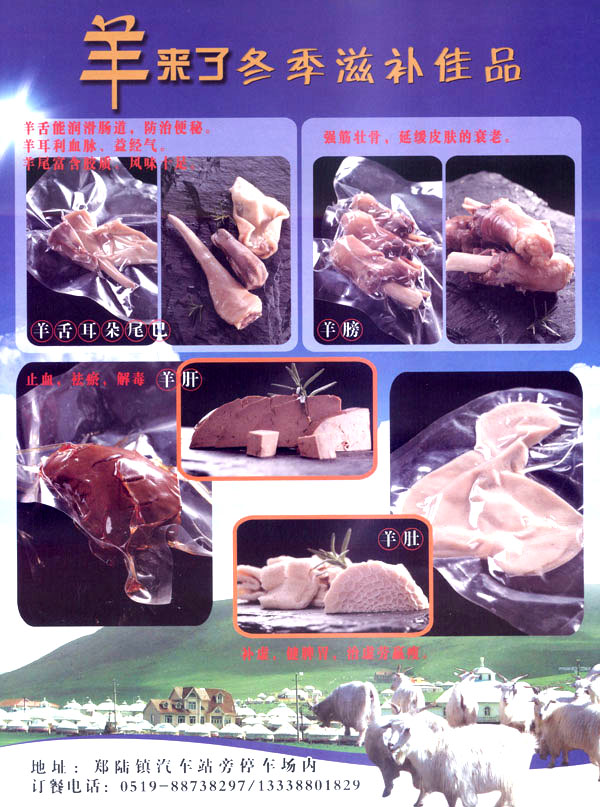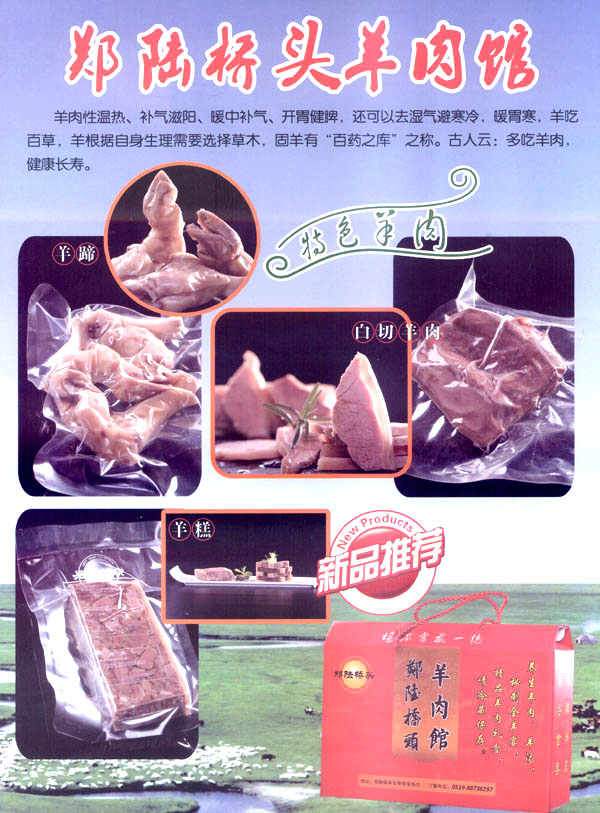 鄭陸橋頭羊肉館主要從事羊肉、羊肉制品的加工。羊肉性溫?zé)、補(bǔ)氣滋陽、暖中補(bǔ)氣、開胃健脾、還可以去濕氣避寒冷,暖胃寒、養(yǎng)吃百草、養(yǎng)根據(jù)自身生理需要選擇草木、固羊有“百藥之庫”之稱。古人云:多吃羊肉、健康長壽。