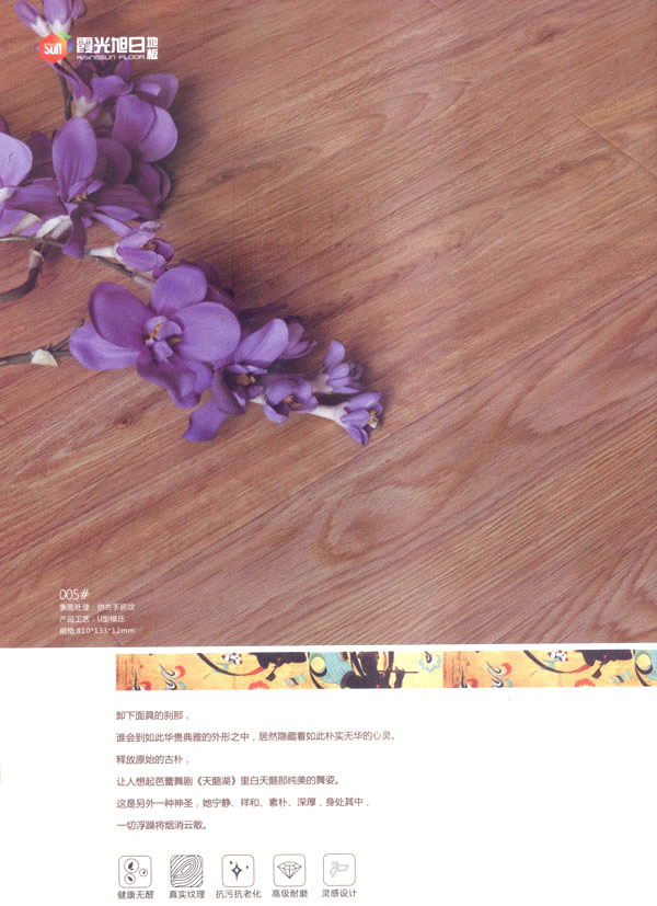 品牌保證,質(zhì)量放心 公司旗下“霞光.旭日”品牌地板系列由旭日皇家、旭日經(jīng)典、旭日戀家、至尊奢華、巧奪天工、水晶陶瓷等幾個系列構(gòu)成,配有專職質(zhì)量檢驗(yàn)人員,嚴(yán)把產(chǎn)品質(zhì)量關(guān),不斷完善產(chǎn)品質(zhì)量體系、監(jiān)控管理體系。公司對客戶需求全面、科學(xué)、準(zhǔn)確地把握,確保對客戶市場適時高效反應(yīng)。一流的設(shè)備、精心的選材、完美的工藝以及對產(chǎn)品品味不倦的追求,令奔公司產(chǎn)品獨(dú)樹一幟。