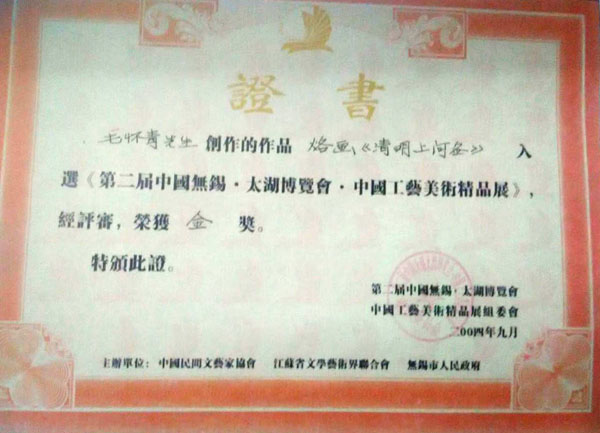 毛懷青,江蘇常州市武進(jìn)人。 中國工藝美術(shù)學(xué)會(huì)會(huì)員,常州市中國烙畫研究會(huì)副會(huì)長,常州市文博鑒賞協(xié)會(huì)理事,非物質(zhì)文化遺產(chǎn)烙畫傳承人。高級(jí)工藝美術(shù)師。 年輕時(shí)學(xué)習(xí)國畫、油畫中年蔓現(xiàn)掌州咯畫源遠(yuǎn)流長、歷史悠久,有著其它美術(shù)門類不具備的藝術(shù)風(fēng)格與特色?芍^是工藝美術(shù)中的一朵十分亮麗的藝術(shù)奇葩,是我民族先人給我們留下的一份不可多得十分珍貴的一份文化遺產(chǎn)。為弘揚(yáng)與發(fā)展這份優(yōu)秀文化遺產(chǎn),我從此下定決心研究烙畫,愿付出一份力量為振興烙畫事業(yè)做出貢獻(xiàn)。至今已潛心研究幾十年,取得了可喜的成績,被業(yè)界公認(rèn),社會(huì)關(guān)注與認(rèn)可。有“江南烙畫第一筆”之美譽(yù)。 近年來,創(chuàng)作的烙畫作品分別獲得過全國、省市級(jí)的金、銀、銅獎(jiǎng)多次。中央電視臺(tái)曾兩次播放過本人的烙畫作品,江蘇電視臺(tái)、常州電視臺(tái)也曾多次播放過本人的作品與烙畫藝術(shù)生涯,揚(yáng)子晚報(bào)、常州日報(bào)、常州晚報(bào)也曾多次報(bào)導(dǎo)過本人的烙畫作品,出版物有三種版本都能查閱到介紹本的烙畫從藝生涯與藝術(shù)業(yè)績。