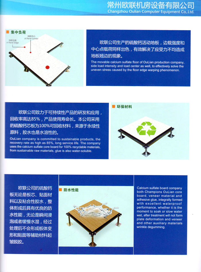 防靜電高架活動(dòng)地板、全鋼地板、陶瓷地板是計(jì)算機(jī)行業(yè)發(fā)展起來(lái)的新型鋪地材料,隔離了潮氣、靜電灰塵,最重要的是解決了綜合布線問(wèn)題,無(wú)需預(yù)埋管線,可隨時(shí)拆卸、搬移,保證了資訊設(shè)備完整的優(yōu)點(diǎn),適應(yīng)了智能化樓宇中信息自動(dòng)化技術(shù)對(duì)所處環(huán)境的特定要求,避免了廣大客戶的雙重投資,使現(xiàn)代化辦公程度更加高效,辦公場(chǎng)所更加舒適。 “歐聯(lián)”系列全鋼地板,符合國(guó)家安全要求,種類完備多樣,其中防靜電陶瓷地板、硫酸鈣地板等除具有普通瓷質(zhì)的裝飾和實(shí)用性外,其耐磨、防水、防火功能優(yōu)于其它同類產(chǎn)品,防靜電系列地板,能切合不同客戶的要求,其靈活的配置,深受客戶歡迎,不同材質(zhì)的地板結(jié)構(gòu)使設(shè)計(jì)師的設(shè)計(jì)空間比傳統(tǒng)的更加廣闊自由和善變。 公司大力發(fā)展國(guó)內(nèi)外銷售業(yè)務(wù),多次中標(biāo)國(guó)內(nèi)重點(diǎn)工程 ,例:哈爾濱醫(yī)科大學(xué)、山東大學(xué)、上海普通機(jī)場(chǎng)等。 公司將一如既往開(kāi)發(fā)和制造一流的產(chǎn)品,愿與廣大有識(shí)之士合作發(fā)展,共創(chuàng)美好未來(lái)。