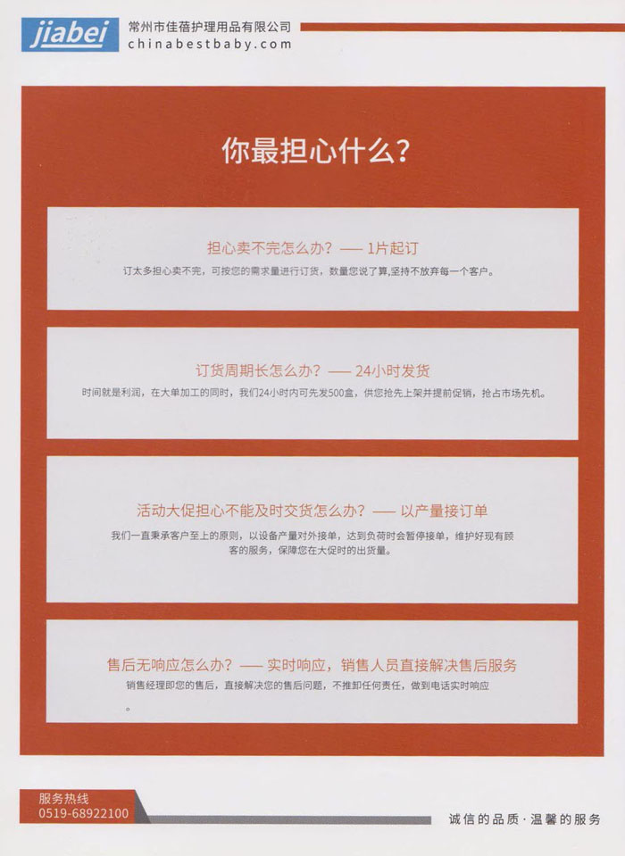 常州市佳蓓護理用品有限公司是一家專業(yè)從事開發(fā)、生產(chǎn)、銷售并具備自營出口的外向型企業(yè),主要生產(chǎn)“一次性防溢乳墊“,以質(zhì)量穩(wěn)定,柔軟親膚而深受客戶和消費者青睞。本公司產(chǎn)品從生產(chǎn)到包裝成品嚴(yán)格執(zhí)行無菌生產(chǎn)標(biāo)準(zhǔn)化流程,并和設(shè)備生產(chǎn)廠家合作開發(fā)了兩條從進料、生產(chǎn)、檢測、滅菌、成品包裝的無菌生產(chǎn)線,從而實現(xiàn)了真正意義上的無菌生產(chǎn)標(biāo)準(zhǔn)化。 佳蓓秉承”用戶至上“的原則,期待與國內(nèi)外客戶真誠合作,同時也誠邀品牌公司貼牌合作,歡迎您的蒞臨和指導(dǎo),與我們攜手合作,共創(chuàng)未來。